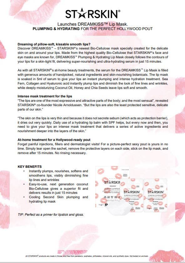 Découvrez le secret d'une bouche hollywoodienne parfaite avec le masque à lèvres repulpant et hydratant en bio-cellulose STARSKIN® Dreamkiss™ , disponible dès maintenant chez Parfas, parfumerie et institut de beauté . Ce masque innovant est enrichi de 5 ml de sérum intensément nourrissant qui transforme vos lèvres en une bouche douce, lisse et parfaitement hydratée en seulement 15 minutes.