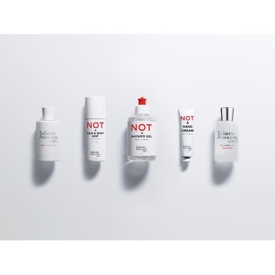 Également en vente chez Parfas : L'iconique NOT a Perfume de Juliette has a Gun. Le gel douche, la crème pour les mains, le spray unique pour les cheveux et le corps de la collection Not a Perfume.
