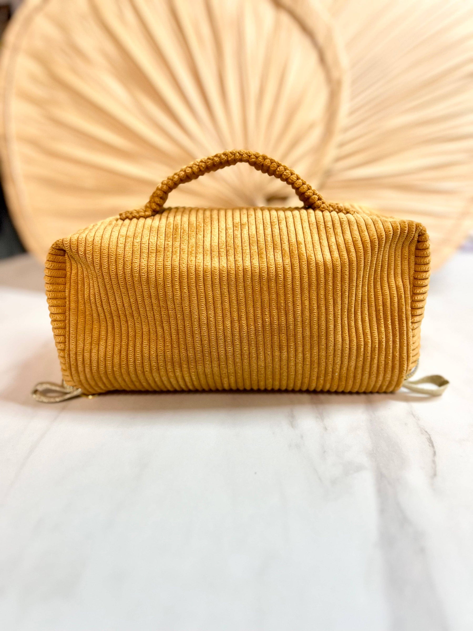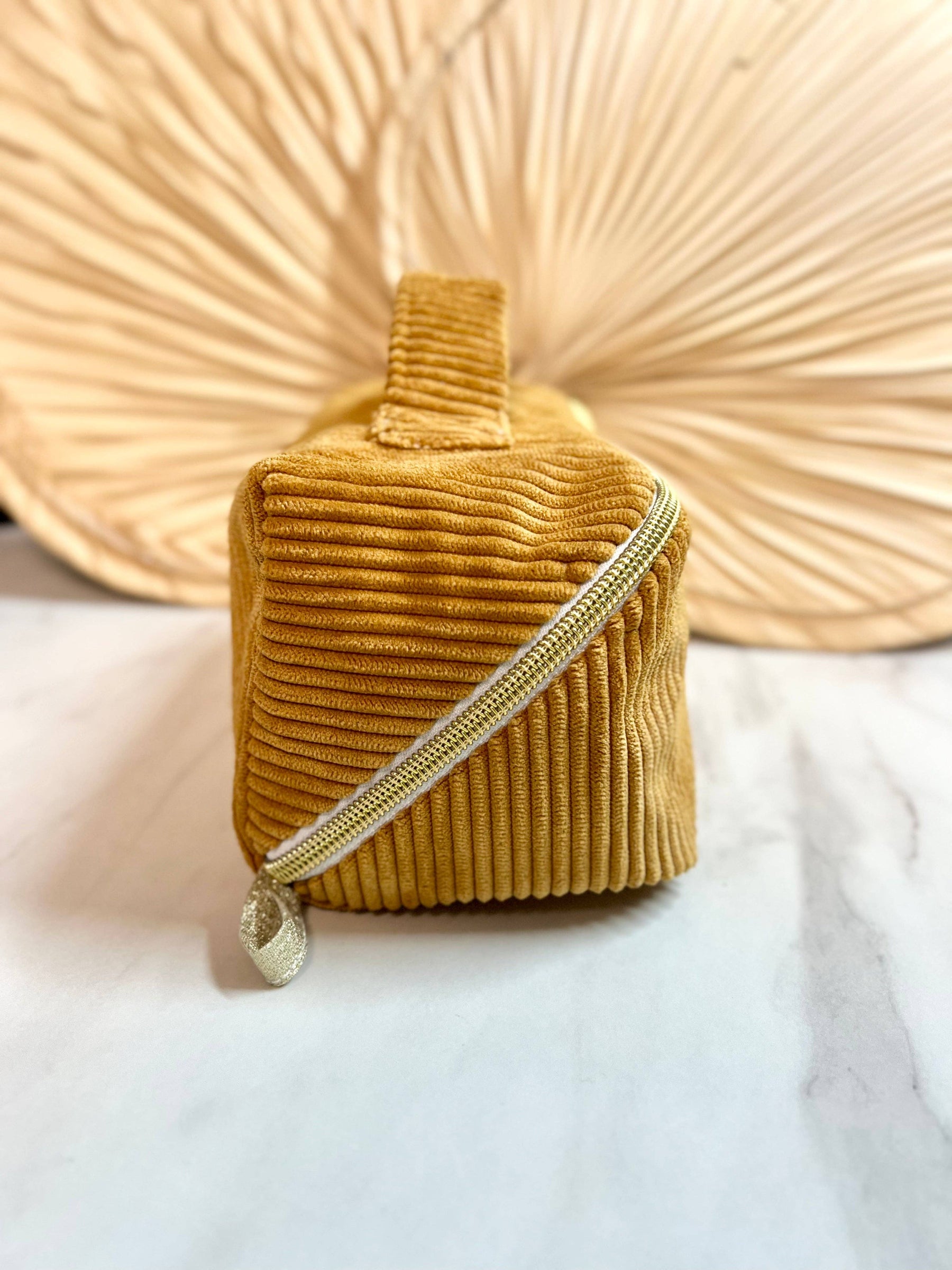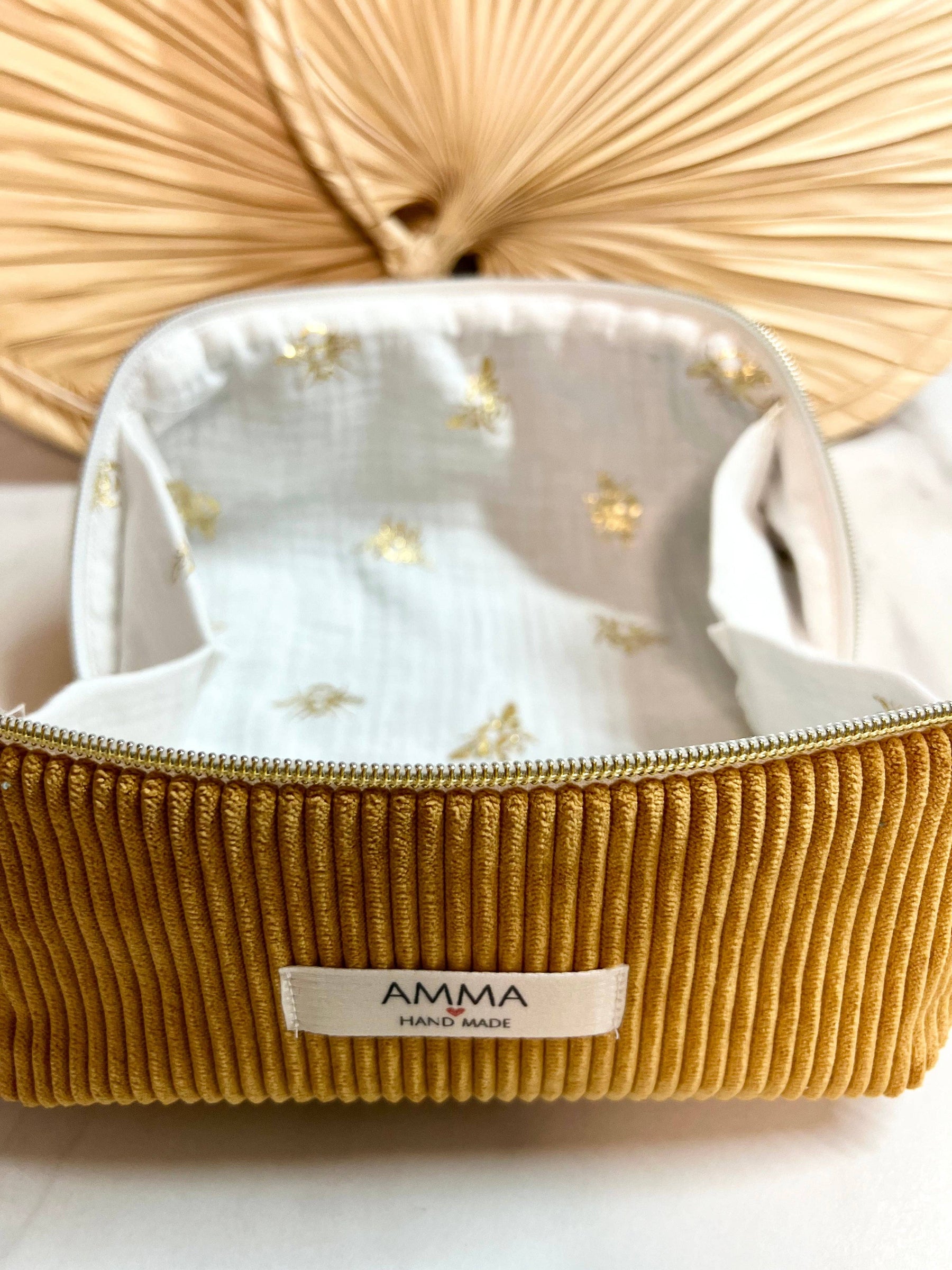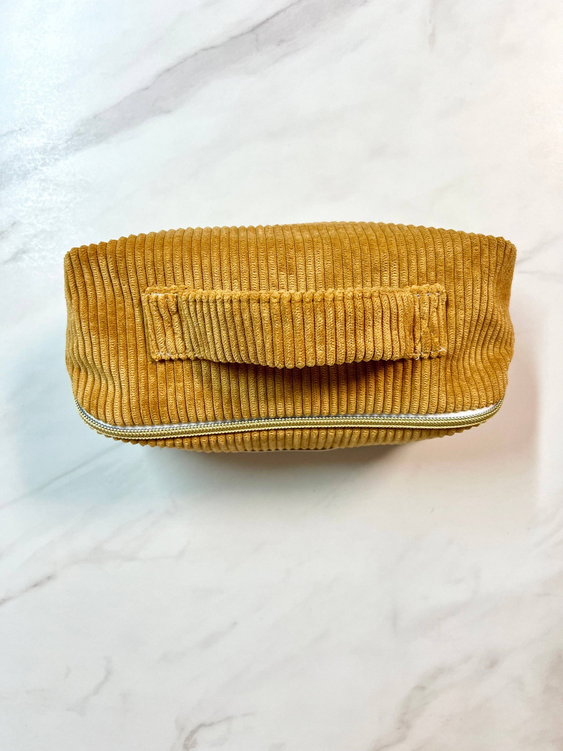 Amma Make-up- en Make-uptasje van Mosterdkleurig Corduroy – Platte Opening